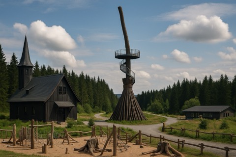 Das Herzstück der Erlebniswelt bildet ein imposanter Aussichtsturm in Form eines riesigen Hexenbesens. Mit einer geplanten Höhe von rund 70 Metern soll der Turm einen atemberaubenden Panoramablick über die Harzer Wälder, Wiesen und Berge bis hin zum Wurmberg und dem Brocken ermöglichen. Bereits jetzt trägt er den Titel des „weltgrößten Hexenbesens“.