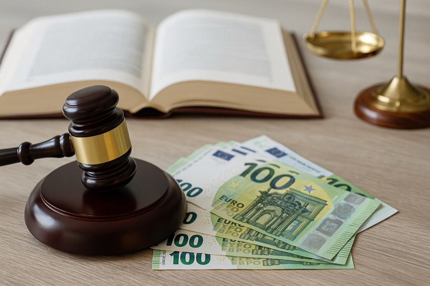 Ein Richterhammer liegt auf 100-Euro-Scheinen, im Hintergrund ein Gesetzbuch und eine goldene Waage. Das Bild symbolisiert gerichtliche Urteile mit Geldstrafe. (Symbolbild – exemplarisch)