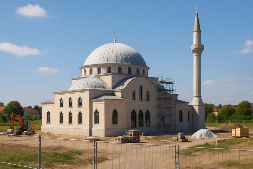 Ein Rohbau mit Minarett und Kuppel erinnert an den möglichen Bau einer Moschee. Das Bild zeigt jedoch kein reales Bauprojekt in Wernigerode. (Symbolbild – exemplarisch)