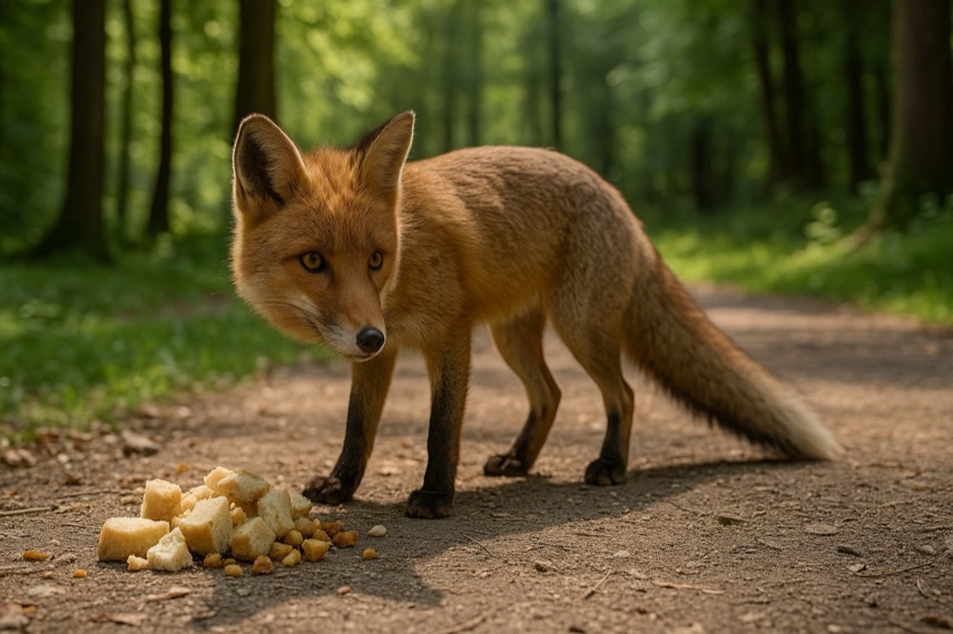 Ein junger Fuchs nähert sich achtlos ausgelegtem Brot auf einem Waldweg im Harz. Die Fütterung bringt Wildtiere in Gefahr. (Symbolbild – exemplarisch)