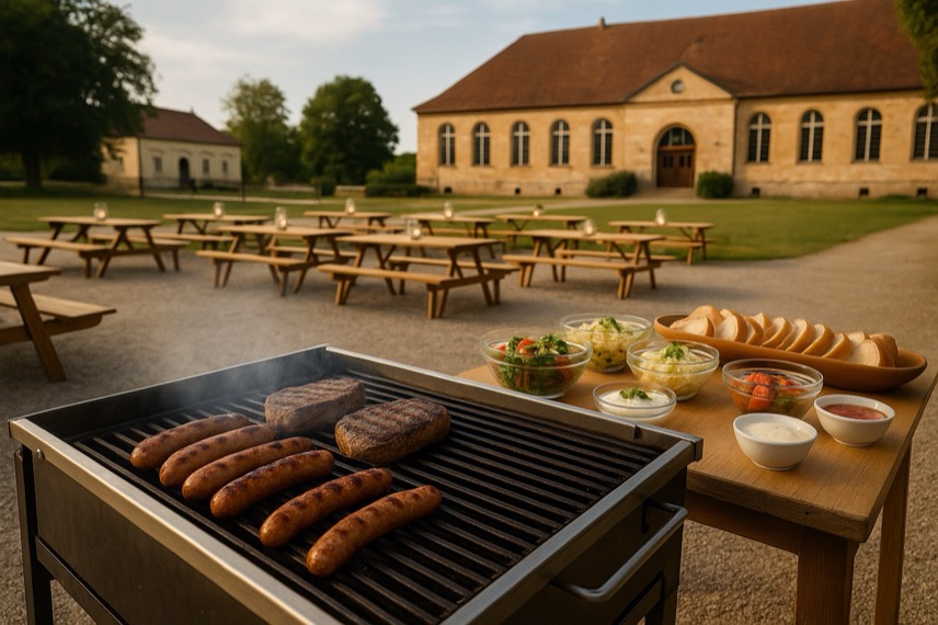 Grillbuffet mit Salaten und Brot vor dem Schlossbahnhof Ballenstedt, bereit für das Sommer-Event. Im Hintergrund: festlich gedeckte Tische. (Symbolbild – exemplarisch)