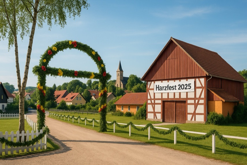 Festlich geschmückter Eingangsbereich zum Harzfest 2025 in Hüttenrode mit typischer Fachwerkscheune und Kirchblick. (Symbolbild – exemplarisch)